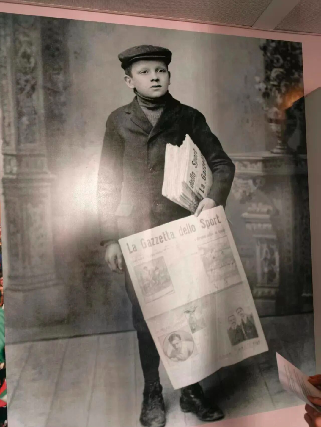 《米兰体育报》诞生于1896年4月3日,创刊当日就报道了即将在雅典举行的首届现代奥林匹克运动会。它比AC米兰俱乐部创立还要早3年。在会议室门口张贴的一张老照片上,一位英俊的报童手里拿着一份打开的《米兰体育报》,腋下还夹着一沓报纸。那是他在兜售《米兰体育报》的创刊号。