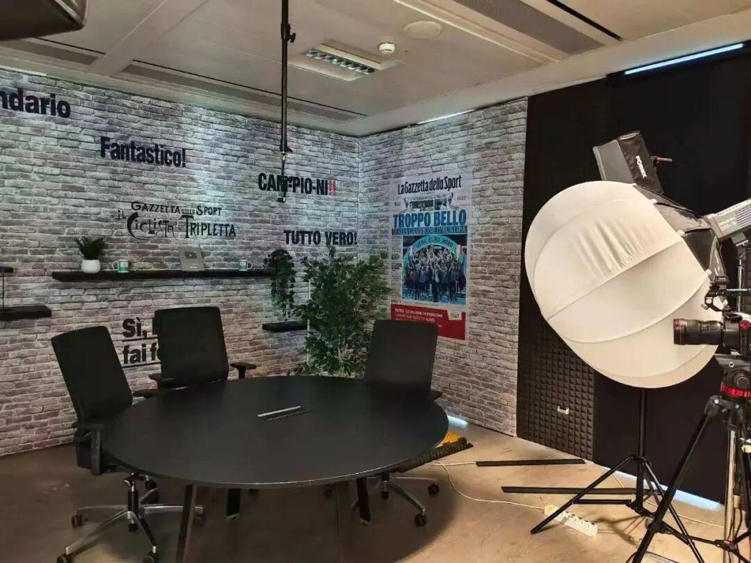他们带我们重点参观了两个演播室。其中一个主要负责播客节目的录制,中间是一个黑色的圆桌,背景相对简单,两边的墙上张贴有《米兰体育报》的海报。圆桌前面有一个巨大的摄影灯,还有摄像机等设备。《米兰体育报》一共开办了四档播客,其中三档与足球相关,另外一档则聚焦其他体育项目。这些播客也已经完全视频化了,主要播出平台就是YouTube、TikTok等新媒体平台。