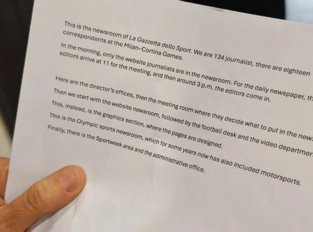 一个有意思的细节是:信心的玛丽莎-波利为了向我们介绍《米兰体育报》,提前在一张纸上打印了要讲解的细节,上面标注的员工还有134位。这可能是玛丽莎-波利的笔误,当然也有可能就在她不知情的情况下又流失了3名员工。