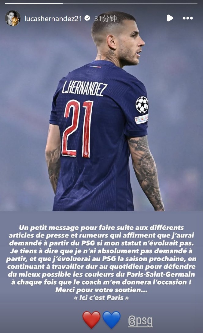 卢卡斯通过社媒发表声明:"针对多家媒体报道的谣言即'如果处境没能改善将申请离队'一事,本人特此声明:我从未主动要求离队,我下赛季将继续效力巴黎圣日耳曼!我会每日刻苦训练,只要教练给予机会,我也将全力捍卫巴黎荣耀!感谢你们的支持...我是巴黎人!"